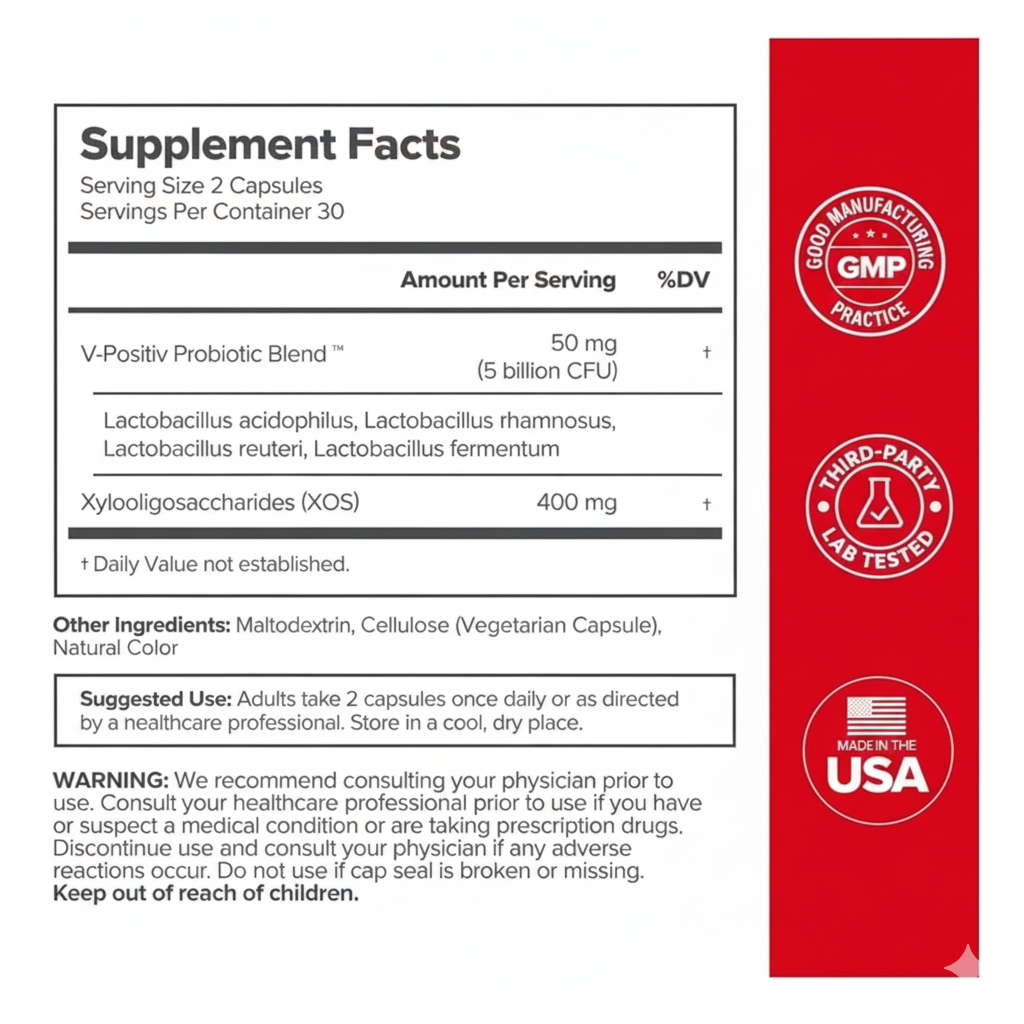 ✨ Mezcla V-Positiv™ – 5 mil millones de UFC: 4 cepas de Lactobacillus clínicamente estudiadas para favorecer la salud vaginal.